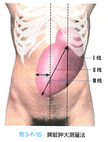 2. 第Ⅱ线测量和第Ⅲ线测量 脾脏明显肿大时,应加测第Ⅱ线和第Ⅲ线,前者系指左锁骨中线与肋缘交点至脾脏最远点的距离(应大于第Ⅰ线测量),后者指脾右缘与