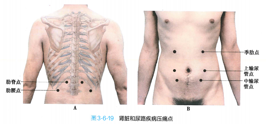 当肾脏和尿路有炎症或其他疾病时,可在相应部位出现压痛点,如图3-6-19所示:①肋脊点: 背部第12肋骨与脊柱的交角(肋脊角)的顶点;②肋腰点:第12肋骨与腰肌外缘的交角(肋腰角) 顶点;③季肋点(前肾点):第10肋骨前端,右侧位置稍低,相当于肾盂位置;④上输尿管点:在脐水 平线腹直肌外缘;⑤中输尿管点:在骼前上棘水平腹直肌外缘,相当于输尿管第二狭窄处。