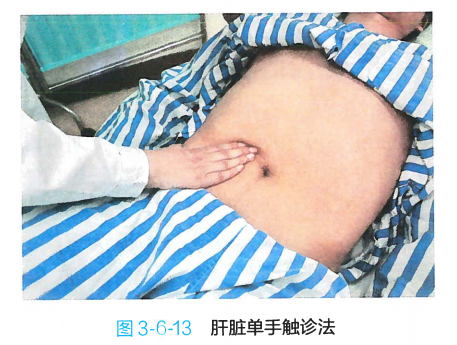 5)如遇腹腔积液病人,深部触诊法不能触及肝脏时,可应用浮沉触诊法,即用并拢三个手指垂直在肝缘附近冲击式连续按压数次,待排开腹腔积液后脏器浮起时常触及肝脏,此法在脾脏和腹 部肿块触诊时亦可应用。