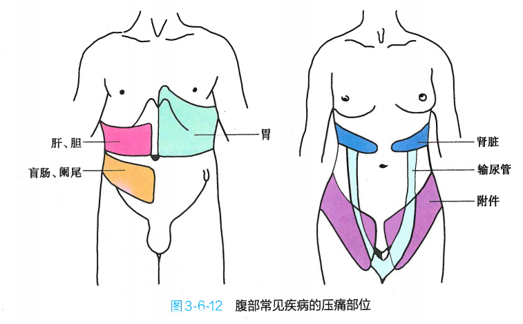 正常腹部触摸时不引起疼痛,重按时仅有一种压迫感。真正的压痛(tenderness) 多来自腹壁或腹腔内的病变。腹壁病变比较表浅,可借抓捏腹壁或仰卧位作屈颈抬肩动作使腹壁肌肉紧张时触 痛更明显,而有别于腹腔内病变引起者。腹腔内的病变,如脏器的炎症、淤血、肿瘤、破裂、扭转以及腹膜的刺激(炎症、出血等)等均可引起压痛,压痛的部位常提示存在相关脏器的病变。腹部常见疾病的压痛点位置见图3-6-12。