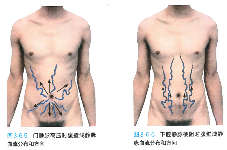 腹壁静脉曲张(或扩张)常见于门静脉高压(portal hypertension)致循环障碍或上、下腔静脉回流受阻而有侧支循环形成时,此时腹壁静脉可显而易见或迂曲变粗,称为腹壁静脉曲张。门静脉 高压显著时,于脐部可见到一簇曲张静脉向四周放射,形如水母头(caput medusae),常在此处听到静脉血管杂音。