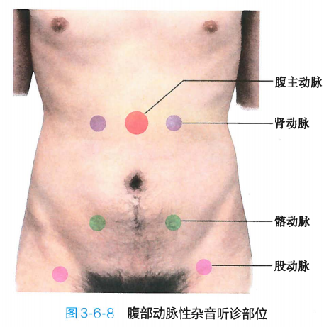 腹部血管杂音对诊断某些疾病有一定作用,因此听诊中不应忽视。血管杂音有动脉性和静脉性杂音。动脉性杂音常在腹中部或腹部两侧。腹中部的收缩期血管杂音(喷射性杂音)常提示腹主动脉瘤或腹主动脉狭窄。前者可触到该部搏动的肿块;后者则搏动减弱,下肢血压低于上肢,严重者触不到足背动脉搏动。如收缩期血管杂音在左、右上腹,常提示肾动脉狭窄,可见于年轻的高血压病人。如该杂音在下腹两侧,应考虑骼动脉狭窄(图3-6-8)。当左叶肝癌压迫肝动脉或腹主动脉时,也可在肿块部位听到吹风样杂音或在肿瘤部位(较表浅时)听到轻微的连续性杂音。