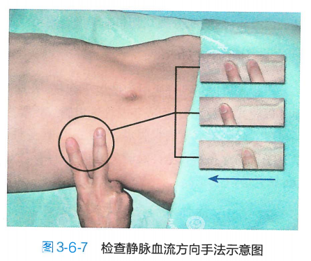检查血流方向可选择一段没有分支的腹壁静脉,医生将右手示指和中指并拢压在静脉上,然后一只手指紧压静脉向外滑动,挤出该段静脉内血液,至一定距离后(约7.5~10cm) 放松该手指,另一手指紧压不动,看静脉是否充盈,如迅速充盈,则血流方向是从放松的一端流向紧压手指的一端。再同法放松另一手指,观察静脉充盈速度,即可看出血流方向(图3-6-7)。