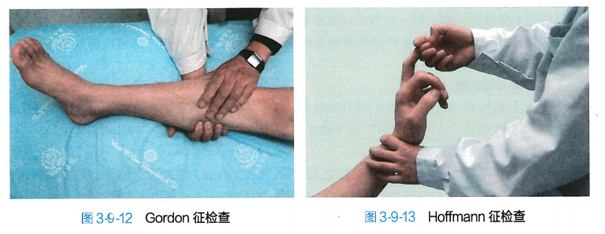 3.Gordon征 检查时用手以一定力量捏压腓肠肌,阳性表现同Babinski征(图3-9-12)。 以上3种体征临床意义相同,其中Babinski征是最典型的病理反射。
