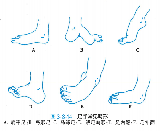 (3)马蹄足:踝关节跖屈,前半足着地,常因跟腱挛缩或腓总神经麻痹引起。