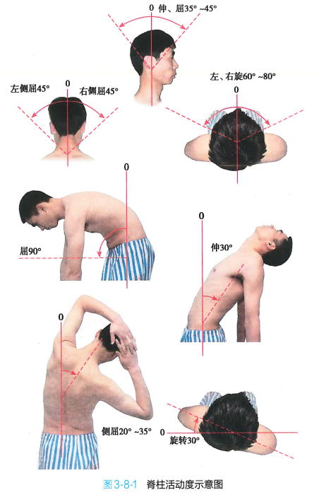 检查脊柱的活动度时,应让病人作前屈、后伸、侧弯、旋转等动作,以观察脊柱的活动情况及有无变形(图3-8-1)。已有脊柱外伤可疑骨折或关节脱位时,应避免脊柱活动,以防止损伤脊髓。正 常人直立、骨盆固定的条件下,颈段、胸段、腰段的活动范围参考值见表3-8-1。