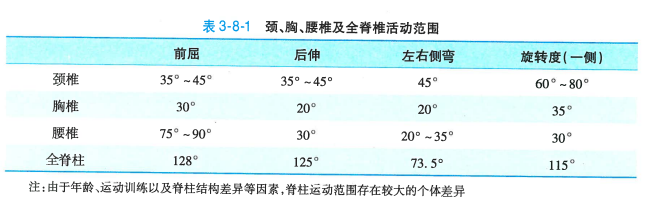 1. 正常活动度 正常人脊柱有一定活动度,但各部位活动范围明显不同。颈椎段和腰椎段的活动范围最大;胸椎段活动范围最小;骶椎和尾椎已融合成骨块状,几乎无活动性。
