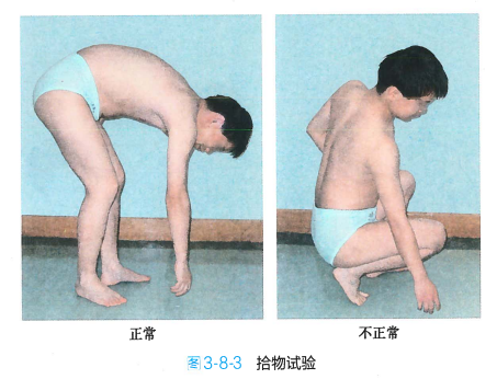 2. 拾物试验 将一物品放在地上,嘱病人拾起。腰椎正常者可两膝伸直,腰部自然弯曲,俯身将物品拾起。如病人先以一手扶膝蹲下,腰部挺直地用手接近物品,此即为拾物试验阳性。多见于腰椎病变如腰椎间盘脱出,腰肌外伤及炎症(图3-8-3)。