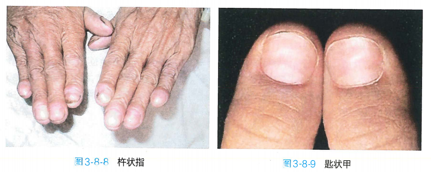 (1)杵状指(趾)(acropachy): 手指或足趾末端增生、肥厚、增宽、增厚,指甲从根部到末端拱形隆起呈杵状(图3-8-8)。其发生机制可能与肢体末端慢性缺氧、代谢障碍及中毒性损害有关,缺氧时末端肢体毛细血管增生扩张,因血流丰富软组织增生,末端膨大。杵状指(趾)常见于:①呼吸系统疾病,如慢性肺脓肿、支气管扩张和支气管肺癌;②某些心血管疾病,如发绀型先天性心脏病,亚急性感染性心内膜炎;③营养障碍性疾病,如肝硬化。