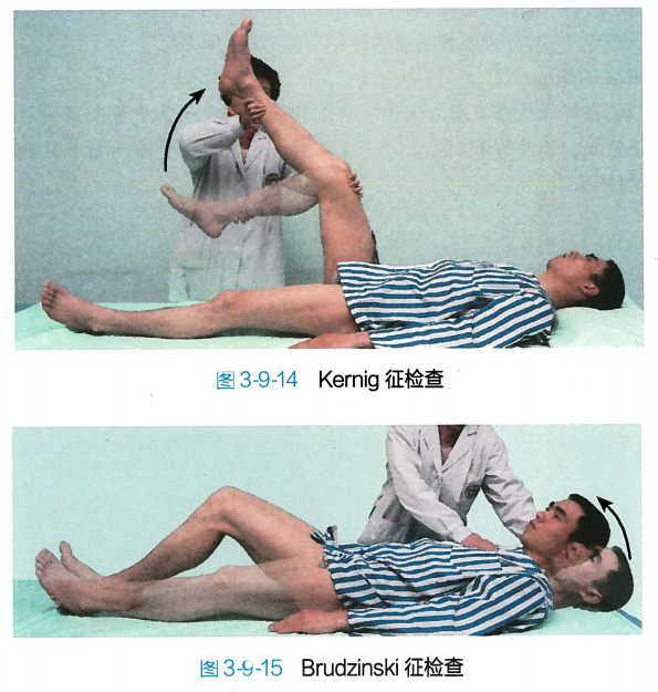 2.Kernig征 病人仰卧, 一侧下肢髋、膝关节屈曲成直角,检查者将病人小腿抬高伸膝。正常人膝关节可伸达135°以上(图3-9-14)。如伸膝受阻且伴疼痛与屈肌痉挛,则为阳性。