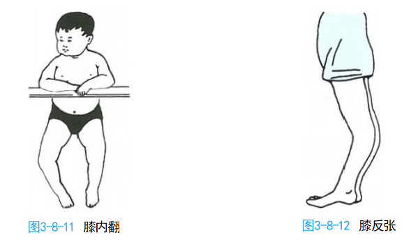 3. 膝反张 膝关节过度后伸形成向前的反屈状(图3-8-12),称膝反张畸形,见于小儿麻痹后遗症、膝关节结核。