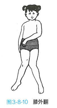 1.膝外翻( genu valgum) 嘱病人暴露双膝关节,处站立位及平卧位进行检查,直立时双腿并拢,两股骨内髁及两胫骨内踝可同时接触,如两踝距离增宽,小腿向外偏斜,双下肢呈“X”状,称“X 形腿”(图3- 8-10),见于佝偻病。