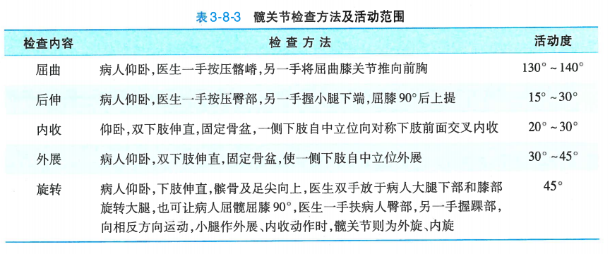 6. 活动度 髋关节检查方法及活动范围见表3-8-3。