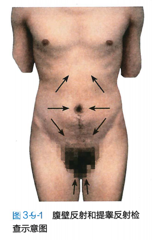 2. 腹壁反射 (abdominal reflex) 检查时,病人仰卧,下肢稍屈曲,使腹壁松弛,然后用钝头 竹签分别沿肋缘下(胸髓7~8节)、脐平(胸髓9~10节)及腹股沟上(胸髓11~12节)的方向,由外向内轻划两侧腹壁皮肤(图3-9-1),分别称为上、中、下腹壁反射。正常反应是上、中或下部局部腹肌收缩。反射消失分别见于上述不同平面的胸髓病损。双侧上、中、下部反射均消失也见于昏迷和急性腹膜炎病人。 一侧上、中、下部腹壁反射均消失见于同侧锥体束病损。肥胖、老年及经产妇由于腹壁过于松弛也会出现腹壁反射减弱或消失,应予以注意。