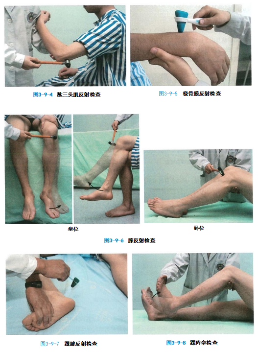 刺激骨膜、肌腱经深部感受器完成的反射称深反射,又称腱反射。检查时病人要合作,肢体肌肉应放松。检查者叩击力量要均等,两侧要对比。