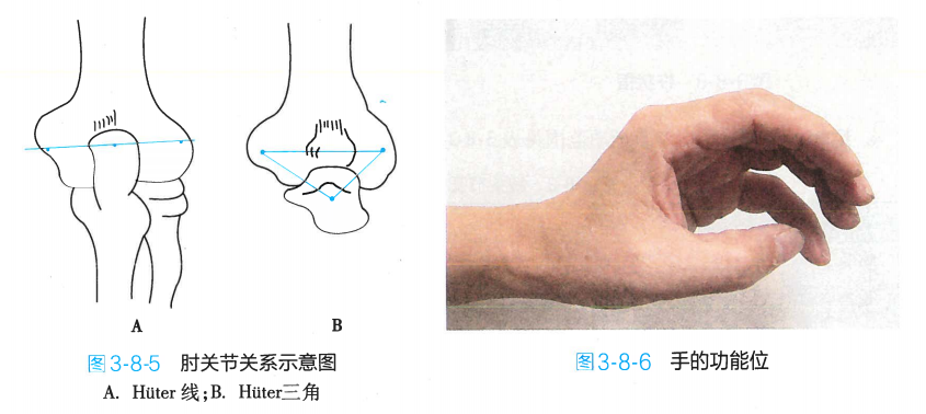 1.形态 正常肘关节双侧对称,伸直时肘关节轻度外翻,称携物角,约5°~15°,检查此角时嘱病人伸直两上肢,手掌向前,左右对比。此角>15°为肘外翻:<15°为肘内翻。肘部骨折,脱位可引起肘关节外形改变,如髁上骨折时,可见肘窝上方突出,为肱骨下端向前移位所致;桡骨头脱位时,肘窝外下方向桡侧突出;肘关节后脱位时,鹰嘴向肘后方突出,Huter线及Hiuter三角(肘关节伸直时肱骨内外上髁及尺骨鹰嘴形成的连线,和屈肘时形成的三角)解剖关系改变(图3-8-5)。检查肘关节时应注意双侧及肘窝部是否饱满、肿胀。肘关节积液和滑膜增生常出现肿胀。