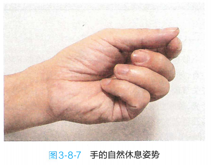 1. 外形 手的功能位置为腕背伸30°并稍偏尺侧,拇指于外展时掌屈曲位,其余各指屈曲,呈握茶杯姿势(图3-8-6)。手的自然休息姿势呈半握拳状,腕关节稍背伸约20°,向尺侧倾斜约10° 拇指尖靠达示指关节的桡侧,其余四指呈半屈曲状,屈曲程度由示指向小指逐渐增大,且各指尖均指向舟骨结节处(图3-8-7)。