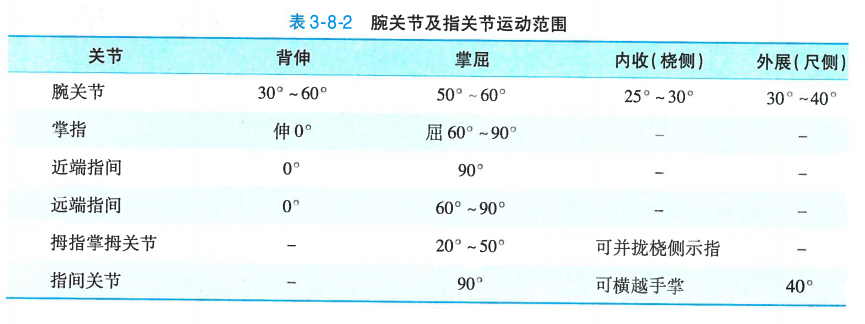 4.运动 腕关节及指关节运动范围见表3-8-2。