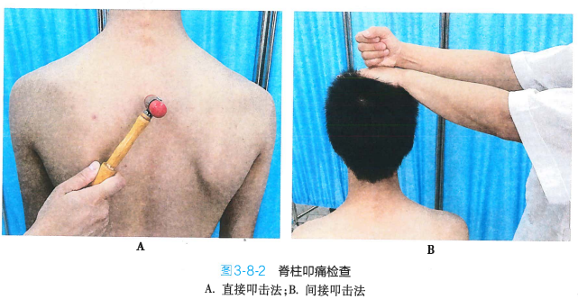 (1)直接叩击法:即用中指或叩诊锤垂直叩击各椎体的棘突(图3-8-2A), 多用于检查胸椎与腰椎。颈椎疾病,特别是颈椎骨关节损伤时,因颈椎位置深,一般不用此法检查。