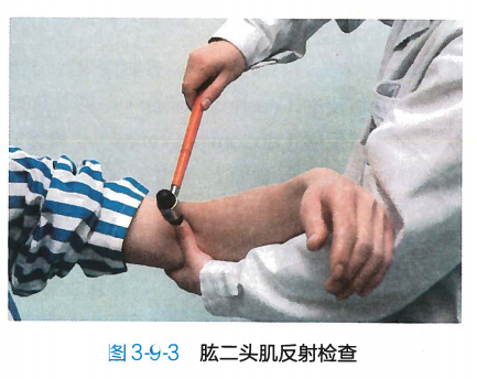 1.肱二头肌反 射 (biceps tendonreflex) 病人前臂屈曲,检查者以左手拇指置于病人肘部肱二头肌腱上,然后右手持叩诊锤叩击检查者左手拇指,可使病人肱二头肌收缩,前臂快速屈曲(图3-9-3)。反射中枢为颈髓5~6节。