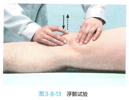 (1)浮髌试验:病人取平卧位,下肢伸直放松,医生一手虎口卡于患膝髌骨上极,并加压压迫髌上囊,使关节液集中于髌骨底面,另一手示指垂直按压髌骨并迅速抬起,按压时髌骨与关节面有碰触感(图3-8-13),松手时髌骨浮起,即为浮髌试验阳性,提示有中等量以上关节积液(50ml)。