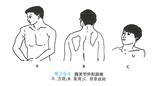 1.外形 嘱被检者脱去上衣,取坐位,在良好的照明情况下,观察双肩的外形有无改变。正常双肩对称,双肩呈弧形,如肩关节弧形轮廓消失肩峰突出,呈“方肩”,见于肩关节脱位或三角肌萎 缩。两侧肩关节一高一低,颈短耸肩,见于先天性肩胛高耸症及脊柱侧弯。锁骨骨折,远端下垂,使该侧肩下垂,肩部突出畸形如戴肩章状,见于外伤性肩锁关节脱位(图3-8-4),锁骨外端过度上翘所致。