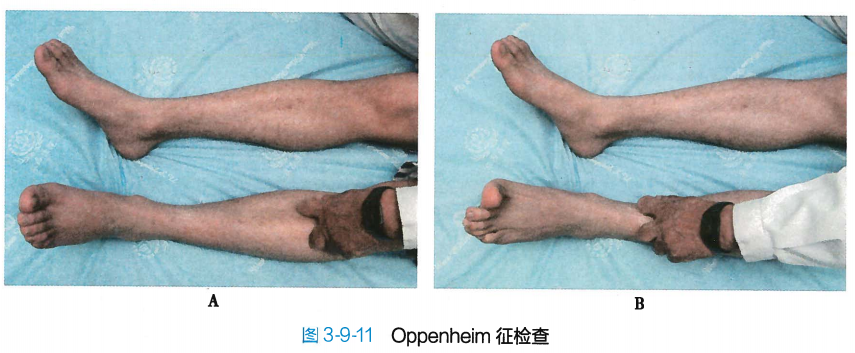 2.Oppenheim征 检查者弯曲示指及中指,沿病人胫骨前缘用力由上向下滑压,阳性表现同Babinski征(图3-9-11)。