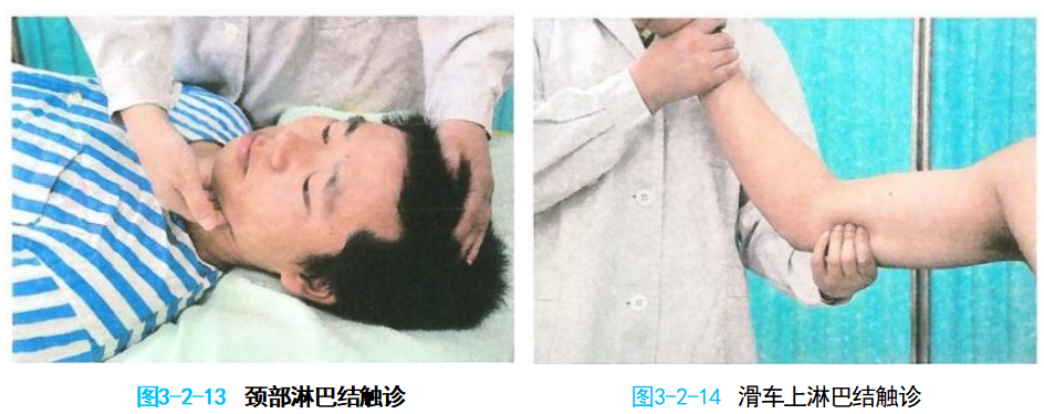 检查颈部淋巴结时可站在被检查前面或背后,手指紧贴检查部位,由浅及深进行滑动触诊,嘱被检查者头稍低,或偏向检查侧,以使皮肤或肌肉松弛,有利于触诊。被检查者卧位时,检查颈部淋巴结(见图3-2-13)。检查锁骨上淋巴结时,让被检查者取坐位或卧位,头部稍向前屈,用双手进行触诊,左手触诊右侧,右手触诊左侧,由浅部逐渐触摸至锁骨后深部。检查腋窝淋巴结时,被检查者前臂稍外展, 检查者以右手检查左侧,以左手检查右侧,触诊时由浅及深至腋窝各部。检查滑车上淋巴结时,以左 (右)手扶托被检查者左(右)前臂,以右(左)手向滑车上由浅及深进行触摸(图3-2-14)。