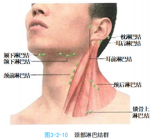 全身体格检查时,淋巴结的检查应在相应身体部位检查过程中进行。为了避免遗漏应特别注 意淋巴结的检查顺序。头颈部淋巴结的检查顺序是:耳前、耳后、枕部、颌下、颏下、颈前、颈后、锁骨 上淋巴结。上肢淋巴结的检查顺序是:腋窝淋巴结、滑车上淋巴结。腋窝淋巴结应按腋尖群、中央 群、胸肌群、肩胛下群和外侧群的顺序进行。下肢淋巴结的检查顺序是:腹股沟淋巴结(先查上群、 后查下群)、腘窝淋巴结。