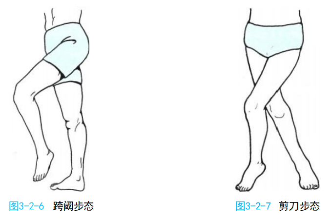 6. 剪刀步态 (scissors gait) 由于双下肢肌张力增高,尤以伸肌和内收肌张力增高明显, 移步时下肢内收过度,两腿交叉呈剪刀状。见于脑性瘫痪与截瘫病人(图3-2-7)。