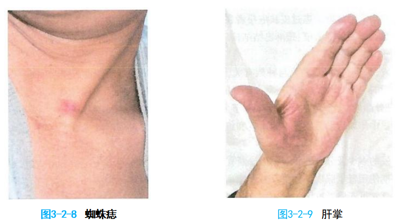 慢性肝病病人手掌大、小鱼际处常发红,加压后退色,称为肝掌(liver palm)(图3-2-9),发生机制与蜘蛛痣相同。