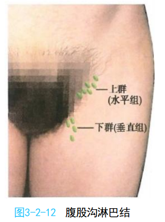 (2)下群:位于大隐静脉上端,沿静脉走向排列,故又称为腹股沟淋巴结纵组或垂直组。