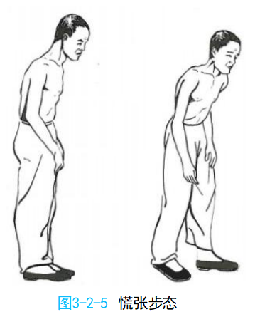 4. 慌张步态 (festinating gait) 起步后小步急速趋行,双脚擦地,身体前倾,有难以止步之势。见于帕金森病病人(图3-2-5)。