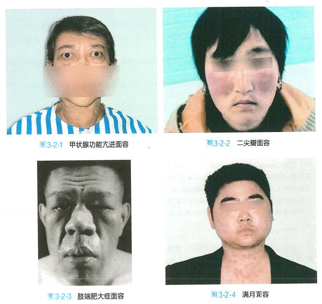 通过视诊即可确定病人的面容和表情,临床上常见的典型面容改变有以下几种: