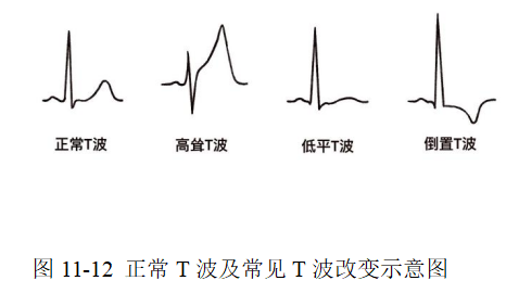T波代表心室晚期快速复极时的电位改变。正常T波形态表现为两支不对称,前支的坡度比后支小;T波的方向多与QRS波群的主波方向一致;在以R波为主的导联上,T波振幅一般不应低于同导联R波的1/10。若T波表现两支对称、方向与主波方向相反或电压低于同导联R波的1/10,常提示心肌缺血。正常T波及常见T波改变见图11-12。