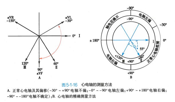 1.概念 心电轴通常指的是平均QRS心电轴(meanQRSaxis),它是心室除极过程中全部瞬间向量的综合(平均QRS向量),借以说明心室在除极过程这一总时间内的平均电势方向和强度。它是空间性的,但心电图学中通常所指的是它投影在前额面上的心电轴,可用任何两个肢体导联的QRS波群的振幅或面积计算出心电轴。正常心电轴的范围为-30°~+90°之间;电轴位于-30°~-90°范围为心电轴左偏;位于+90°~+180°范围为心电轴右偏;位于-90°~-180°范围,定义为“不确定电轴”(indeterminateaxis)(图5-1-16A)。除测定QRS波群电轴外,还可用同样方法测定P波和T波电轴。