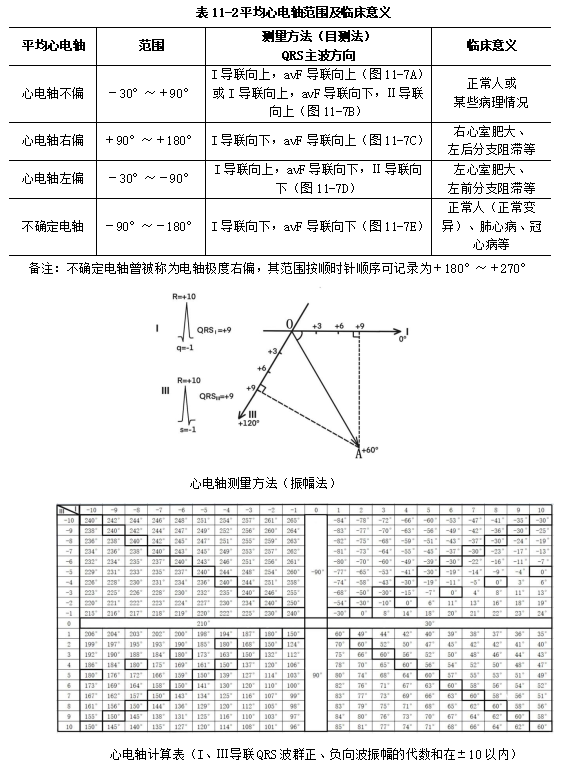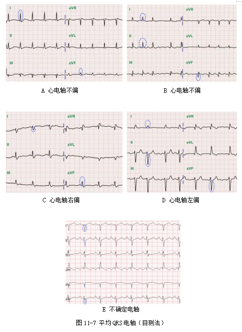 (1)目测法:最常用。主要观察Ⅰ导联、avF导联QRS波群主波(QRS波群中振幅最大的波)方向,需要时再观察Ⅱ导联QRS波群主波方向,可粗略估测心电轴范围。