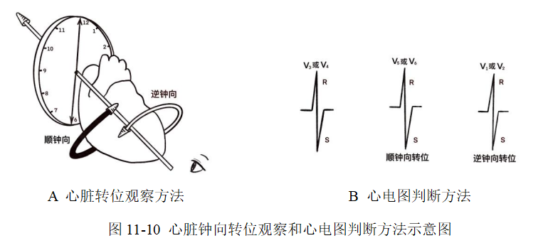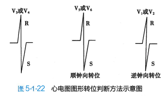 自心尖部朝心底部方向观察,设想心脏可循其本身长轴作顺钟向或逆钟向转位。正常时V₃或V₄导联R/S大致相等,为左、右心室过渡区波形。顺钟向转位(clockwiserotation)时,正常在V₃或V₄导联出现的波形转向左心室方向,即出现在Vs、V₆导联上。逆钟向转位(counterclockwiserotation)时,正常V₃或V₄导联出现的波形转向右心室方向,即出现在V₁、V₂导联上。顺钟向转位可见于右心室肥厚,而逆钟向转位可见于左心室肥厚。但需要指出,心电图上的这种转位图形在正常人亦常可见到,提示这种图形改变有时为心电位的变化,并非都是心脏在解剖上转位的结果(图5-1-22)。