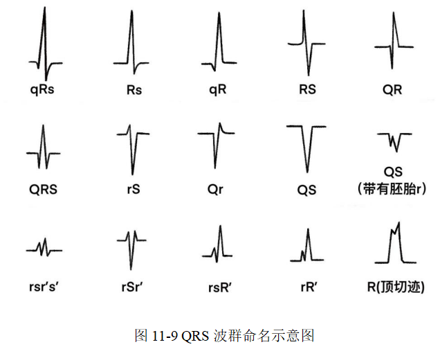 1.QRS波群的命名 QRS波群形态比较复杂,命名原则为:首个出现于基线以上的正向波称R波,R波之前的负向波称Q波,R波之后第一个负向波称S波,S波之后的正向波称R'波,R'波之后的负向波称S’波。至于命名中英文字母大小写的采用,取决于各波电压的大小,通常振幅<0.5mV,用小写字母q、r、s表示;振幅≥0.5mV,则用大写字母Q、R、S表示。但若QRS波群只有负向波,不论电压大小,均称为QS波。QRS波群命名如图11-9。