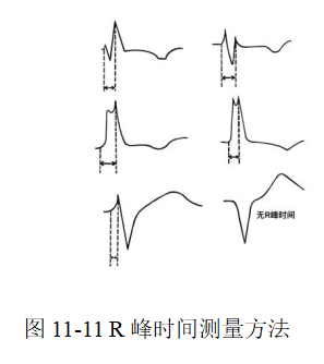 5.R峰时间(R peat time,Rpt) 也称为室壁激动时间(ventricular activation time,VAT),是指QRS起点至R波顶端垂线的间距。若R波有切迹或呈双峰,则应测量至其第二峰;若有R'波,应测量至R'峰(图11-11)。R峰时间正常值在V1、V2 导联≯0.03s, V5、V6导联≯0.05s。R峰时间延长可见于心室肥大、室内传导阻滞、预激综合征等。