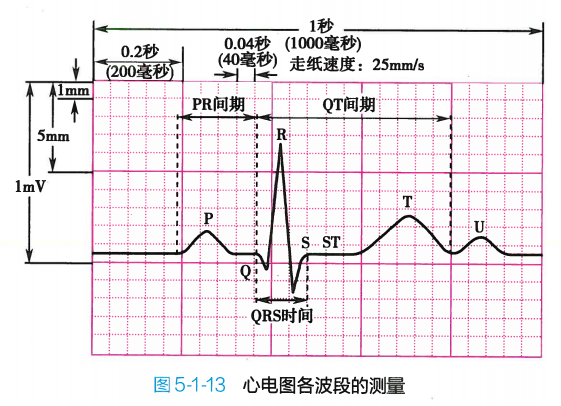 心电图多描记在特殊的记录纸上(图5-1-13)。心电图记录纸由纵线和横线划分成各为1mm²的小方格。当走纸速度为25mm/s时,每两条纵线间(1mm)表示0.04秒(即40毫秒),当标准电压1mV=10mm时,两条横线间(1mm)表示0.1mV。每5个小方格可以构成一个大方格,大方格依然是一个正方形,它的横坐标代表的时间则是0.2秒(200毫秒),而纵坐标代表的电压则是0.5mV。