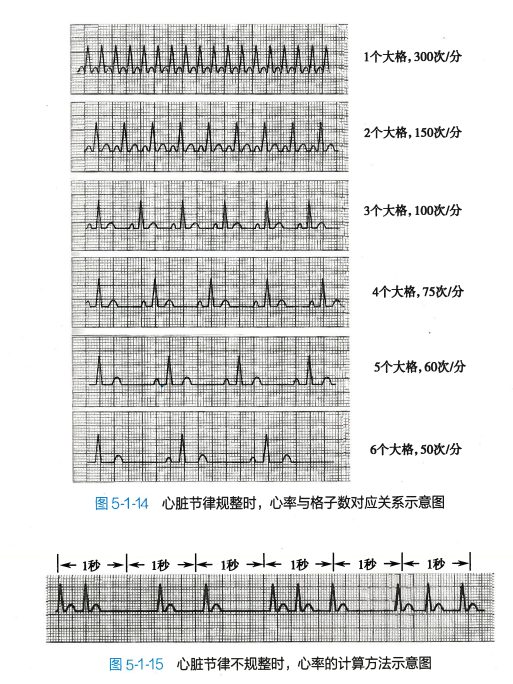 在安静清醒的状态下,正常心率范围在60~100次/分。测量心率时,根据心脏节律是否规整,可采取不同的测量方法:①在心脏节律规整的情况下,只需要测量一个RR(或PP)间期的秒数,然后被60除即可求出。例如RR间距为4个大格(0.8秒),则心率为60/0.8=75次/分,具体如图5-1-14所示。②在心脏节律不规整的情况下,一般可以先数6秒的心搏数,然后乘以10作为心率。如图5-1-15所示的心电图,6秒的心搏数是10次,由此可以粗略计算出心率为10×10=100次/分。此外,还可采用查表法或使用专门的心率尺直接读出相应的心率数。