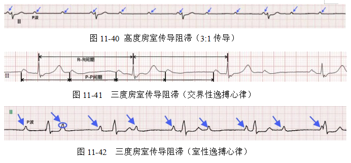 阻滞的部位较低。发生三度房室传导阻滞时,心房与心室分别由两个不同的起搏点激动,各保持自身的节律,心电图上表现为:P波与QRS波毫无关系(PR间期不固定),心房率快于心室率。