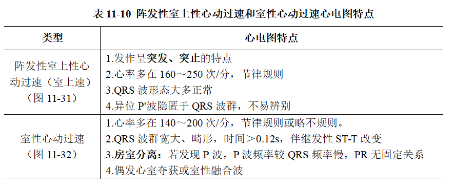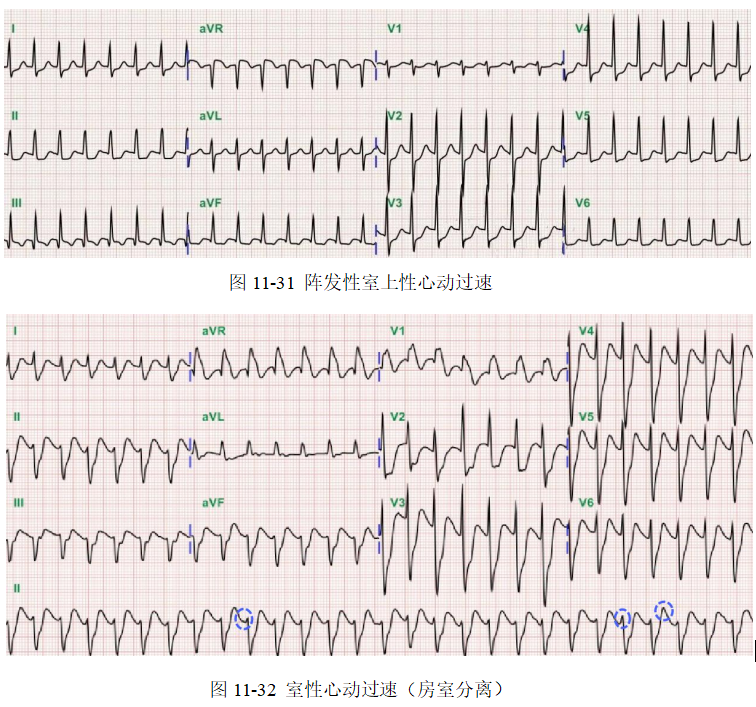 1.阵发性室上性心动过速(paroxysmalsupraventriculartachycardia)理应分为房性以及与房室交界区相关的心动过速,但常因P'不易辨别,故统称为室上性心动过速(室上速)。该类心动过速发作时有突发、突止的特点,频率一般在160~250次/分,节律快而规则,QRS形态一般正常(伴有束支阻滞或室内差异性传导时,可呈宽QRS波心动过速)。临床上最常见的室上速类型为预激旁路引发的房室折返性心动过速(AVRT)以及房室结双径路(dualA-Vnodalpathways)引发的房室结折返性心动过速(A-Vnodalreentrytachycardia,AVNRT)。心动过速通常可由一个房性期前收缩诱发。这两类心动过速病人多不具有器质性心脏病,由于解剖学定位比较明确,可通过导管射频消融术根治。房性心动过速包括自律性和房内折返性心动过速两种类型,多发生于器质性心脏病基础上。