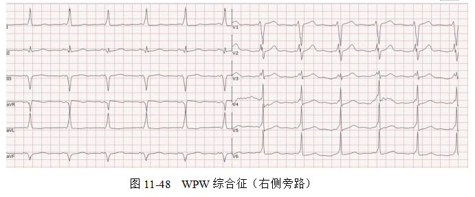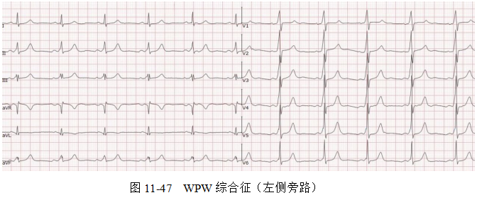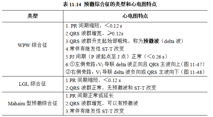 1.WPW综合征(Wolff-Parkinson-Whilesyndrome)又称经典型预激综合征,属显性房室旁路。其解剖学基础为房室环存在直接连接心房与心室的一束纤维(Kent束)。窦房结激动或心房激动可经传导很快的旁路纤维下传预先激动部分心室肌,同时经正常房室结途径下传激动其他部分心室肌,形成特殊的心电图特征:①PR间期缩短<0.12秒;②QRS波增宽≥0.12秒;③QRS波起始部有预激波(delta波);④P-J间期一般正常;⑤出现继发性ST-T改变)。需要注意:心电图delta波的大小、QRS波的宽度及ST-T改变的程度与预激成分的多少有关,少数预激综合征病人的QRS波时间可<0.12秒。根据V₁导联delta波极性及QRS主波方向可对旁路进行初步定位。如V₁导联delta波正向且以R波为主,则一般为左侧旁路;如V₁导联delta波负向或QRS主波以负向波为主,则大多为右侧旁路。部分病人的房室旁路没有前向传导功能,仅有逆向传导功能,心电图上PR间期正常,QRS起始部无预激波,但可反复发作房室折返性心动过速(AVRT),此类旁路称之为隐匿性旁路。