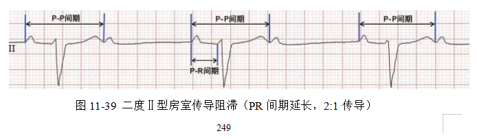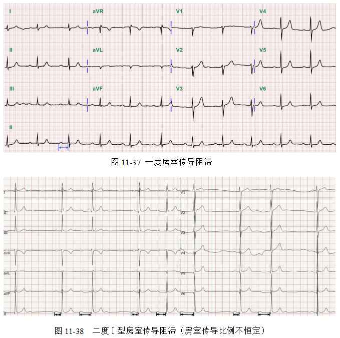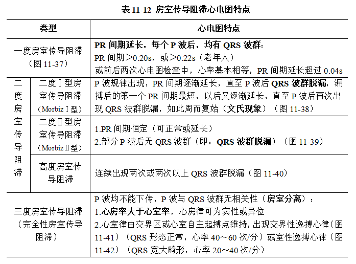 (1)一度房室传导阻滞:心电图主要表现为PR间期延长。在成人若PR间期>0.20秒(老年人PR间期>0.22秒),或对两次检测结果进行比较,心率没有明显改变而PR间期延长超过0.04秒,可诊断为一度房室传导阻滞。PR间期可随年龄、心率而变化,故诊断标准需相适应。