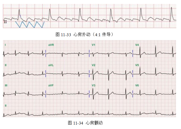 心房扑动的心电图特点为:正常P波消失,代之连续的锯齿状扑动波(F波),多数在Ⅱ、Ⅲ、aVF导联上清晰可见;F波间无等电位线,波幅大小一致,间隔规则,频率为240~350次/分,大多不能全部下传,常以固定房室比例(2:1或4:1)下传,故心室律规则。如果房室传导比例不恒定或伴有文氏传导现象,则心室律可以不规则。心房扑动时QRS波时间一般不增宽。心房扑动如伴1:1房室传导可引起严重的血流动力学改变,应及时处理。如果F波的大小和间距有差异,且频率>350次/分,称不纯性心房扑动或称非典型心房扑动。