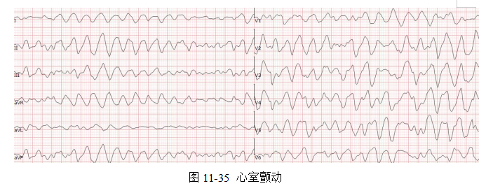 3.心室扑动与心室颤动多数人认为心室扑动(ventricularflutter)是心室肌产生环形激动的结果。出现心室扑动一般具有两个条件:①心肌明显受损、缺氧或代谢失常;②异位激动落在易颤期。心电图特点是无正常QRS-T波,代之以连续快速而相对规则的大振幅波动,频率达200~250次/分,心脏失去排血功能。心室扑动常不能持久,不是很快恢复,便会转为心室颤动而导致死亡。心室颤动ventricularfibrillation)往往是心脏停搏前的短暂征象,也可以因急性心肌缺血或心电紊乱而发生。由于心脏出现多灶性局部兴奋,以致完全失去排血功能。心电图上QRS-T波完全消失,出现大小不等、极不匀齐的低小波,频率200~500次/分。心室扑动和心室颤动均是极严重的致死性心律失常。