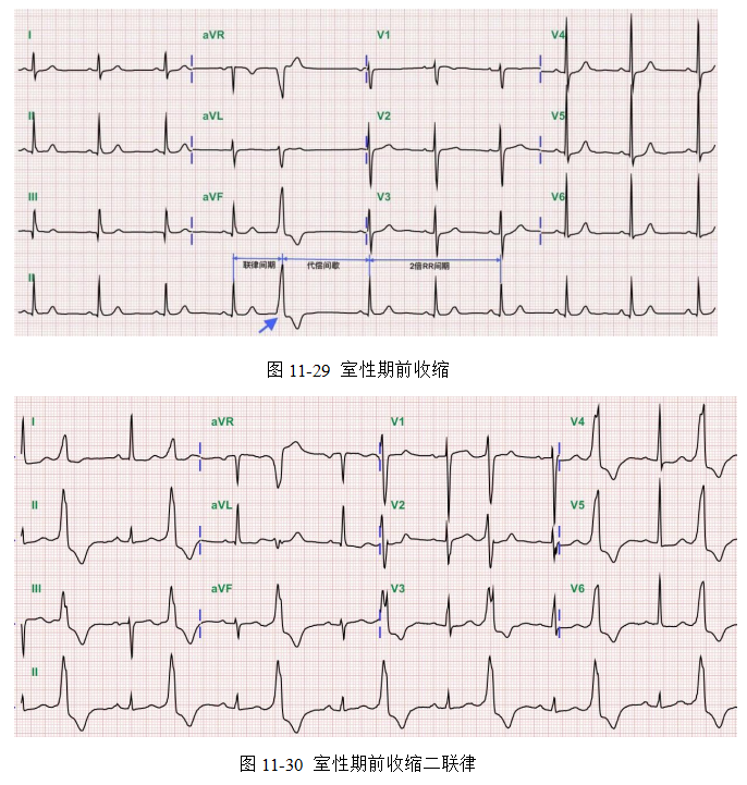 频发性期前收缩:依据出现的频度可人为地分为偶发和频发性期前收缩。常见的二联律(bi-geminy)与三联律(trigeminy)就是一种有规律的频发性期前收缩。前者指期前收缩与窦性心搏交替出现;后者指每2个窦性心搏后出现1次期前收缩。