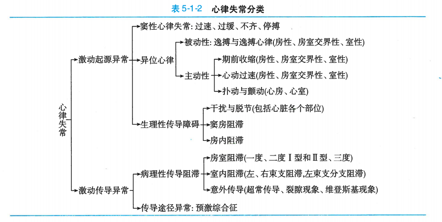 正常人的心脏起搏点位于窦房结,并按正常传导系统顺序激动心房和心室。如果心脏激动的起源异常或(和)传导异常,称为心律失常(arrhythmias)。心律失常的产生可由于:①激动起源异常,可分为两类,一类为窦房结起搏点本身激动的程序与规律异常,另一类为心脏激动全部或部分起源于窦房结以外的部位,称为异位节律,异位节律又分为主动性和被动性;②激动的传导异常,最多见的一类为传导阻滞,包括传导延缓或传导中断;另一类为激动传导通过房室之间的附加异常旁路,使心肌某一部分提前激动,属传导途径异常。③激动起源异常和激动传导异常同时存在,相互作用,此可引起复杂的心律失常表现。心律失常目前多按形成原因进行分类(表5-1-2):